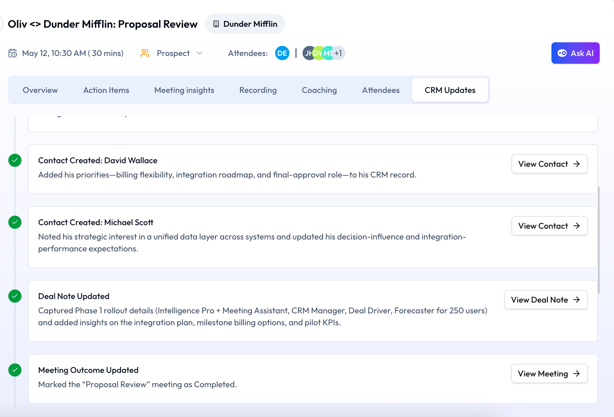 Both. By default, every suggested update surfaces for review before anything hits your CRM. Once your team has built confidence, switch to auto mode for fully hands-free updates.