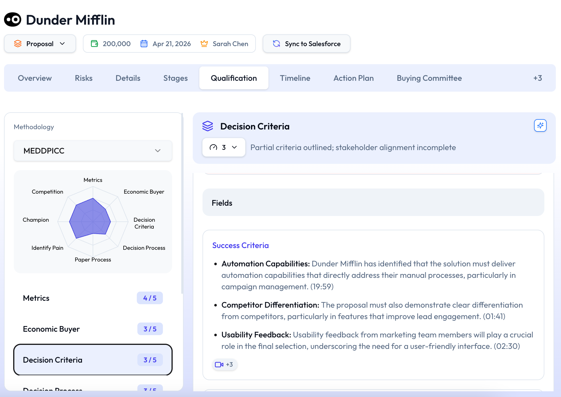 MEDDPICC, BANT, or a custom framework. Every field reflects where the deal actually stands — not the last time someone had a spare minute.